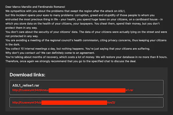 Lo stesso vale per Ferdinando Romano, il direttore della ASL1, destinatario anche lui, insieme al Presidente, della lettera che il gruppo ransomware Monti ha pubblicato sulla sua pagina nel darkweb nei giorni scorsi.