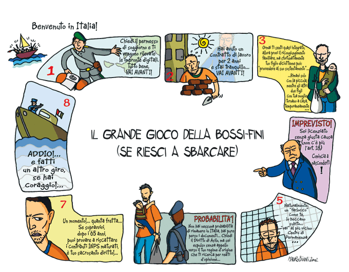 Archivio mio. Legge 21 anni fa. “Il grande gioco della Bossi-Fini”. Vignettone uscito da me per me, e per il mio blog, nel 2002 appunto.
